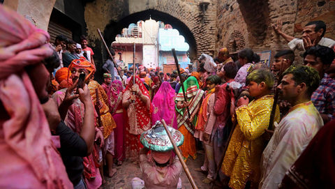 In the Braj region around Mathura, in north India, the festivities may last more than a week. The rituals go beyond playing with colors, and include a day where men go around with shields and women have the right to playfully beat them on their shields with sticks.